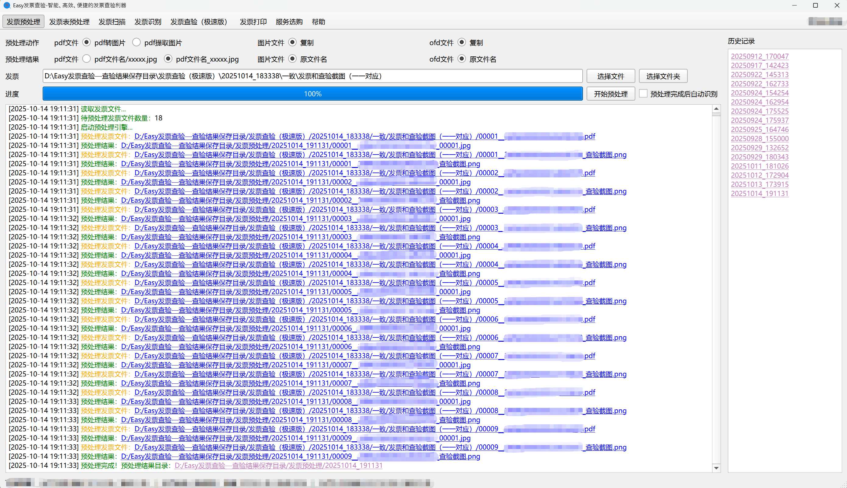 通过发票预处理,软件将”发票和查验截图(一一对应)“文件夹中pdf格式的发票转成图片,同时保留图片格式的查验截图,最终效果就是图片格式的发票和图片格式的查验截图一一对应。